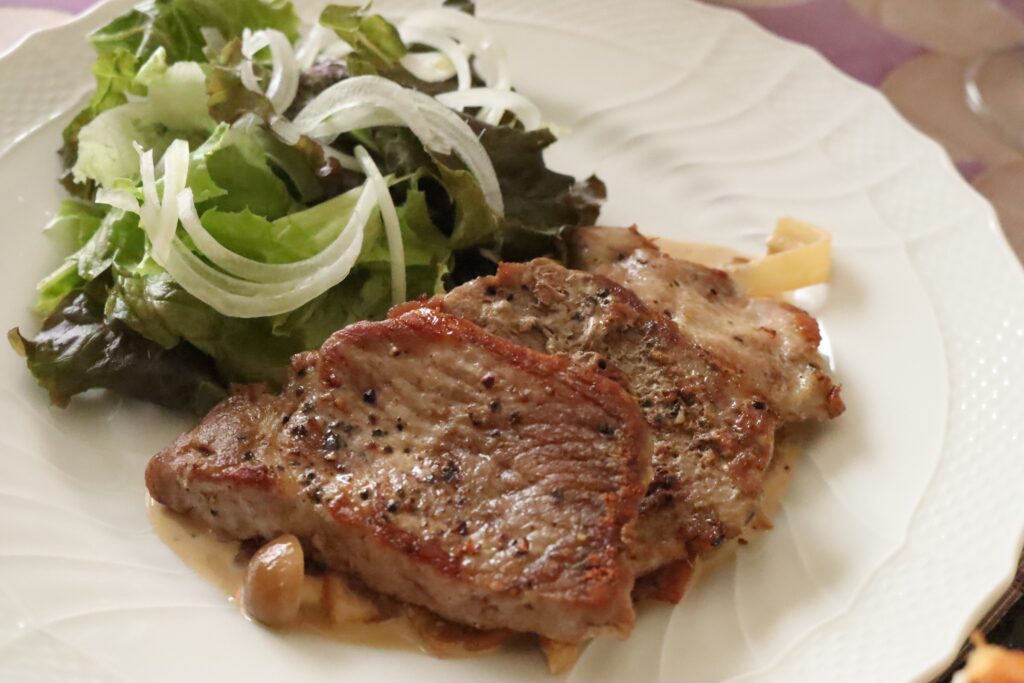 お肉にしっかり目に塩コショウを付けておくことが肝心です。